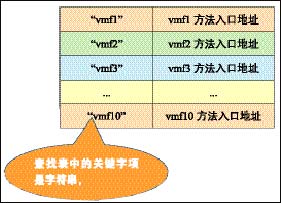 事实上,我们还可以这样理解这种方案的优势,把表中每一项的“方法名”项视为“方法地址”项的描述信息,因此可以认为这种方案中的方法查找表携带自描述信息(或者称为元数据)。基于这种携带自描述信息的数据结构,可以实现丰富多彩的扩展功能,比如在运行时